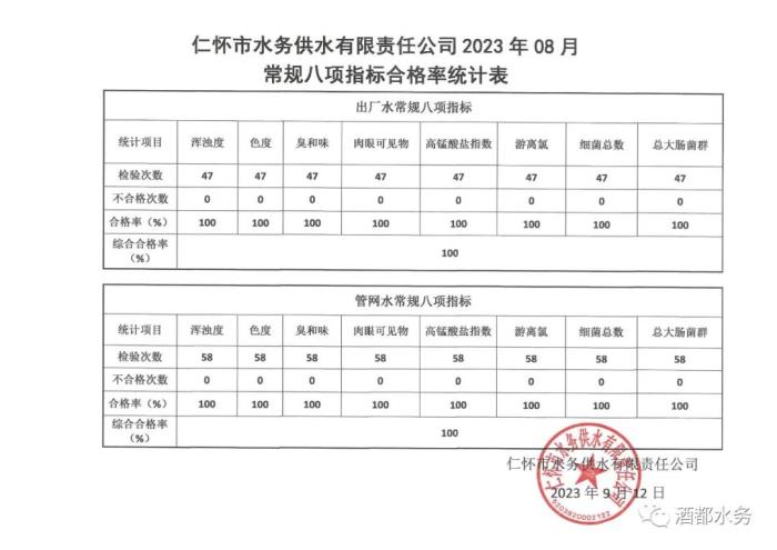 仁懷市水務(wù)供水有限責(zé)任公司2023年8月常規(guī)八項(xiàng)指標(biāo)合格率統(tǒng)計(jì)表
