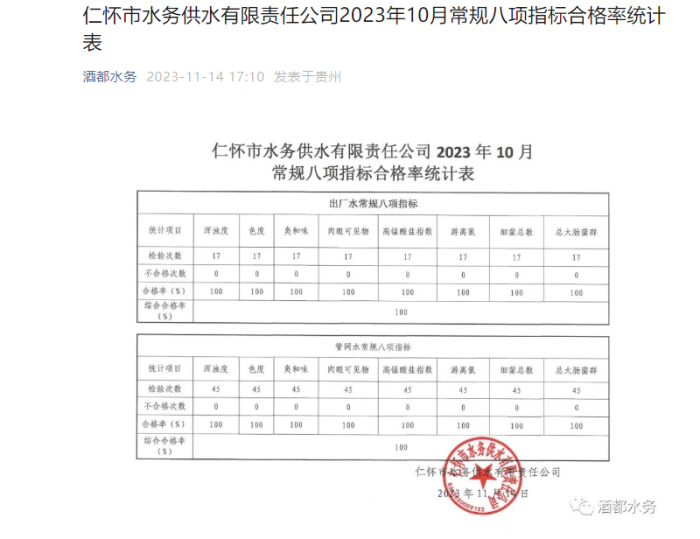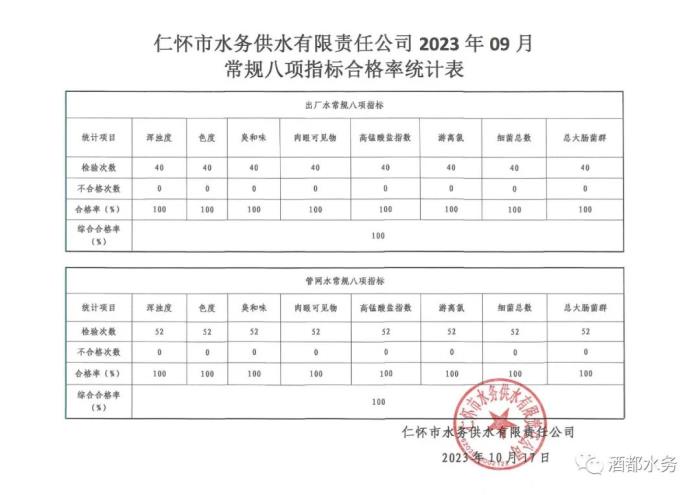 仁懷市水務(wù)供水有限責(zé)任公司2023年10月常規(guī)八項(xiàng)指標(biāo)合格率統(tǒng)計(jì)表