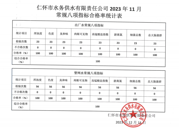 仁懷市水務(wù)供水有限責(zé)任公司2023年11月常規(guī)八項(xiàng)指標(biāo)合格率統(tǒng)計(jì)表