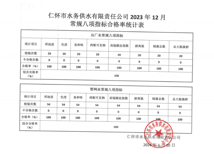 仁懷市水務(wù)供水有限責(zé)任公司2023年12月常規(guī)八項(xiàng)指標(biāo)合格率統(tǒng)計(jì)表