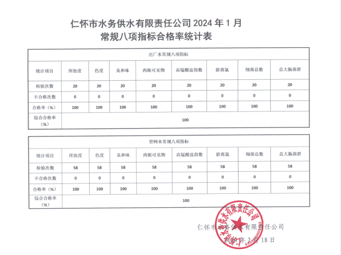 仁懷市水務(wù)供水有限責(zé)任公司2024年1月常規(guī)八項(xiàng)指標(biāo)合格率統(tǒng)計(jì)表
