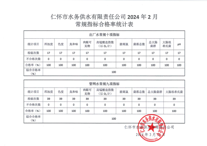 仁懷市水務(wù)供水有限責(zé)任公司2024年2月常規(guī)八項(xiàng)指標(biāo)合格率統(tǒng)計(jì)表