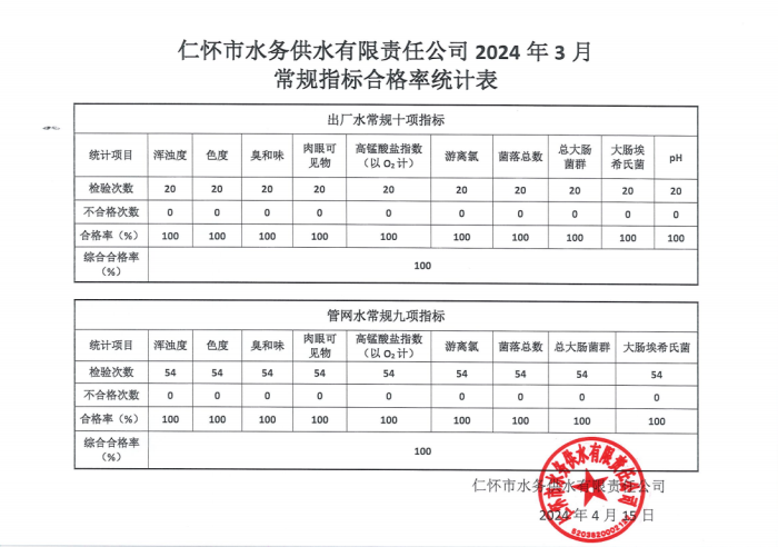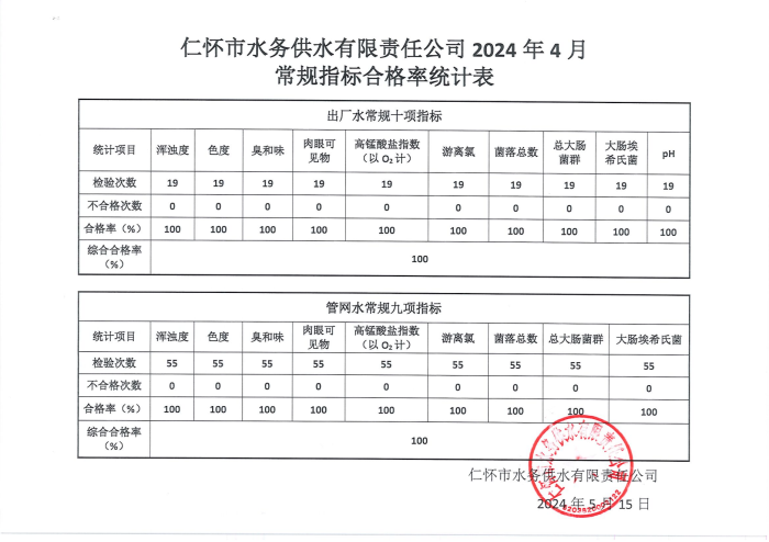仁懷市水務(wù)供水有限責(zé)任公司2024年4月常規(guī)指標(biāo)合格率統(tǒng)計(jì)表