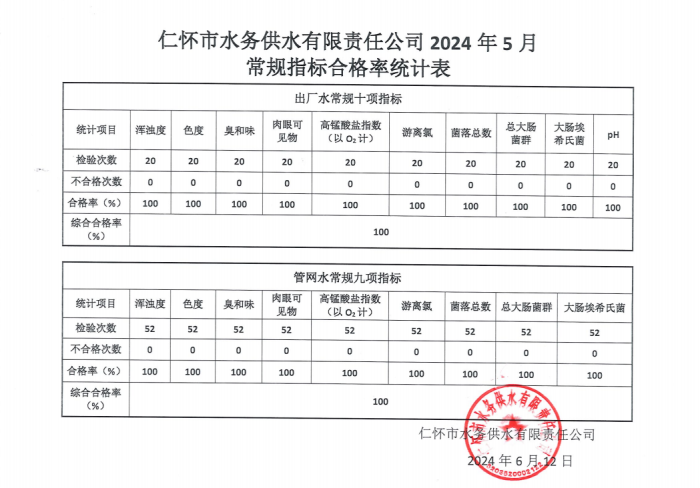 仁懷市水務(wù)供水有限責(zé)任公司2024年5月常規(guī)指標(biāo)合格率統(tǒng)計(jì)表