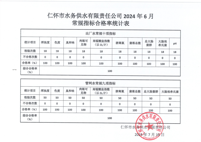 仁懷市水務(wù)供水有限責(zé)任公司2024年6月常規(guī)指標(biāo)合格率統(tǒng)計(jì)表