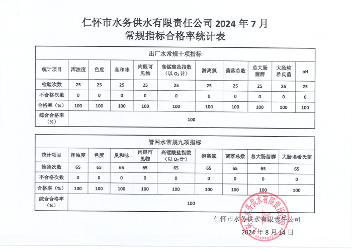 仁懷市水務(wù)供水有限責(zé)任公司2024年7月常規(guī)指標(biāo)合格率統(tǒng)計(jì)表