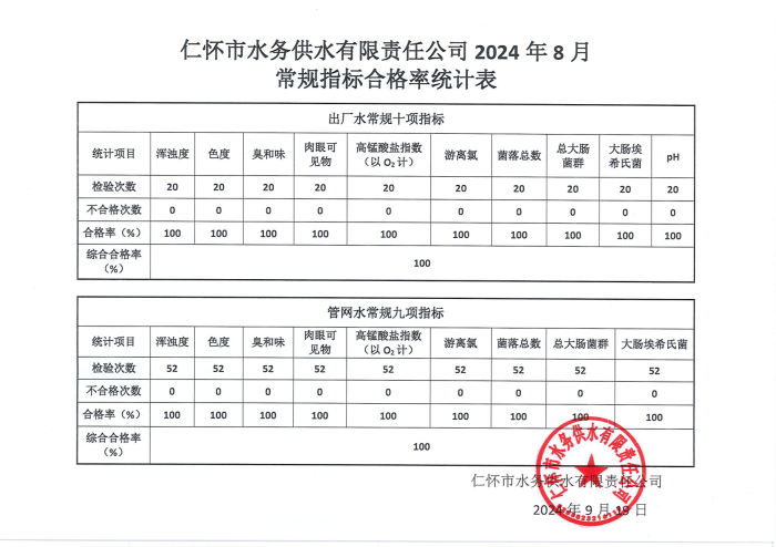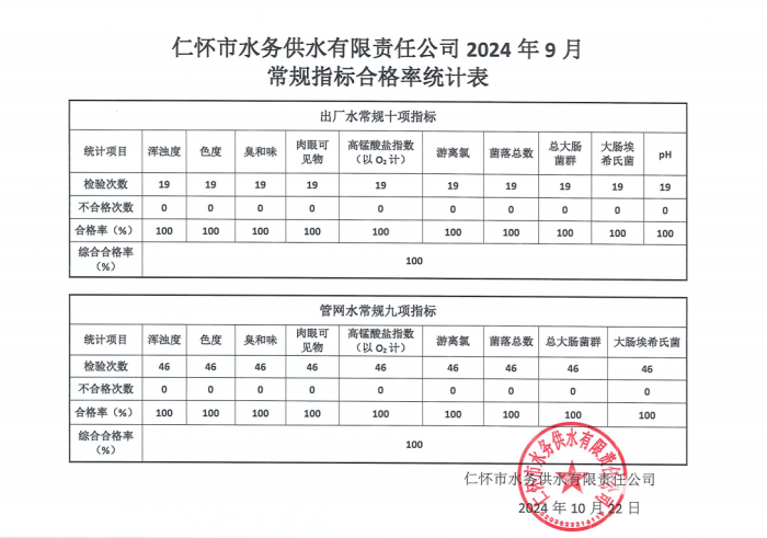 仁懷市水務(wù)供水有限責(zé)任公司2024年9月常規(guī)指標(biāo)合格率統(tǒng)計(jì)表
