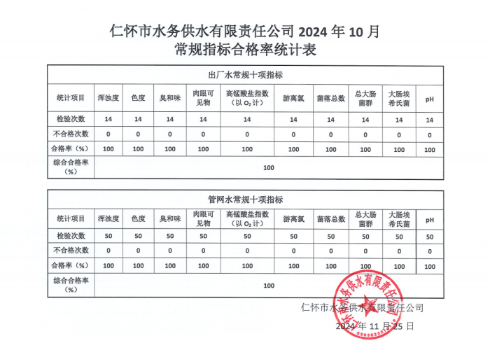 仁懷市水務(wù)供水有限責(zé)任公司2024年10月常規(guī)指標(biāo)合格率統(tǒng)計(jì)表