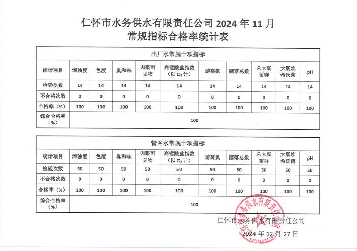 仁懷市水務(wù)供水有限責(zé)任公司2024年11月常規(guī)指標(biāo)合格率統(tǒng)計(jì)表
