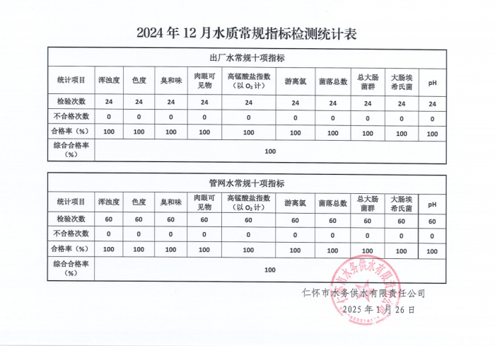 仁懷市水務(wù)供水有限責(zé)任公司2024年12月水質(zhì)常規(guī)指標(biāo)檢測(cè)統(tǒng)計(jì)表