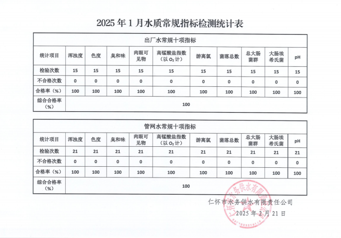 仁懷市水務(wù)供水有限責(zé)任公司2025年1月水質(zhì)常規(guī)指標(biāo)檢測(cè)統(tǒng)計(jì)表