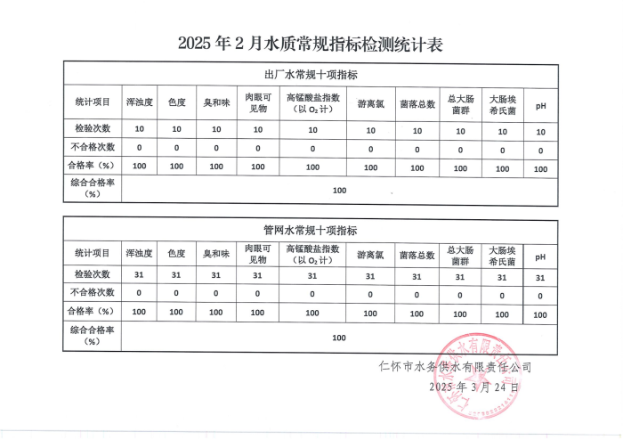 仁懷市水務(wù)供水有限責(zé)任公司2025年2月常規(guī)指標(biāo)合格率統(tǒng)計(jì)表