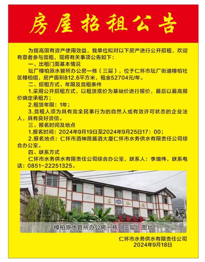 仁懷市水務(wù)供水有限責(zé)任公司壇廠樟柏原水管所辦公房競價拍賣公告