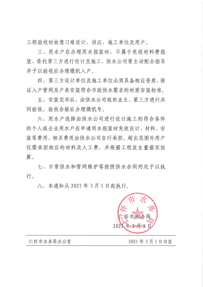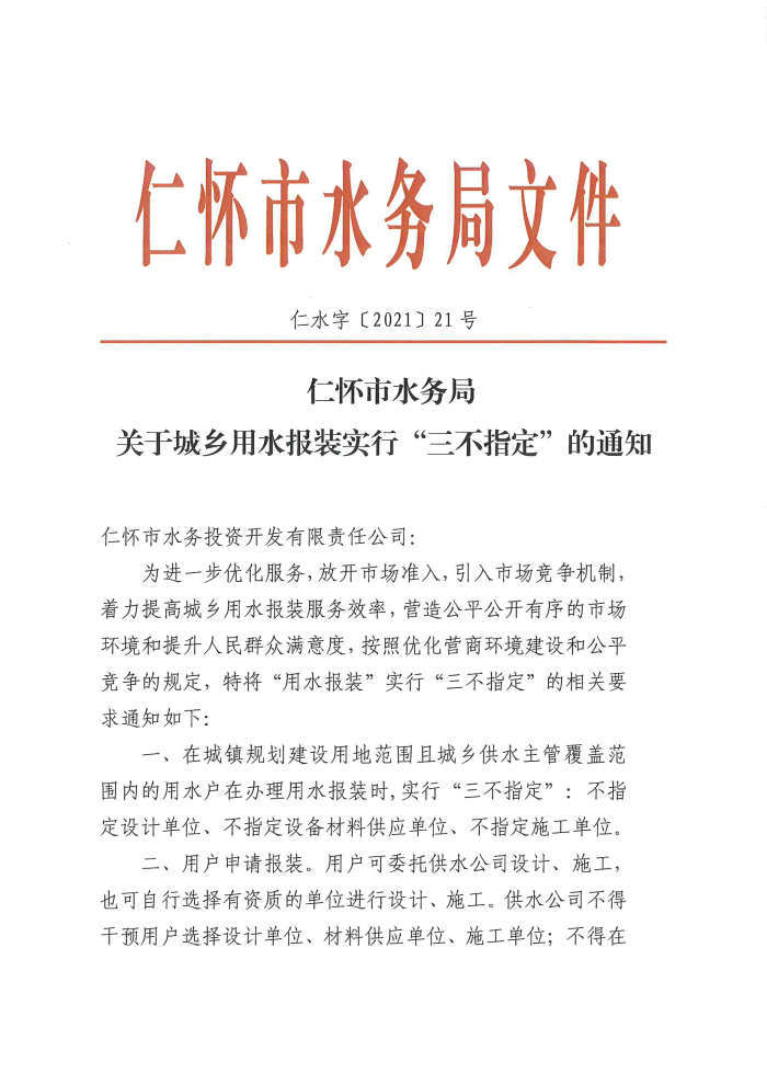 仁懷市水務(wù)局 關(guān)于城鄉(xiāng)用水報(bào)裝實(shí)行“三不指定”的通知