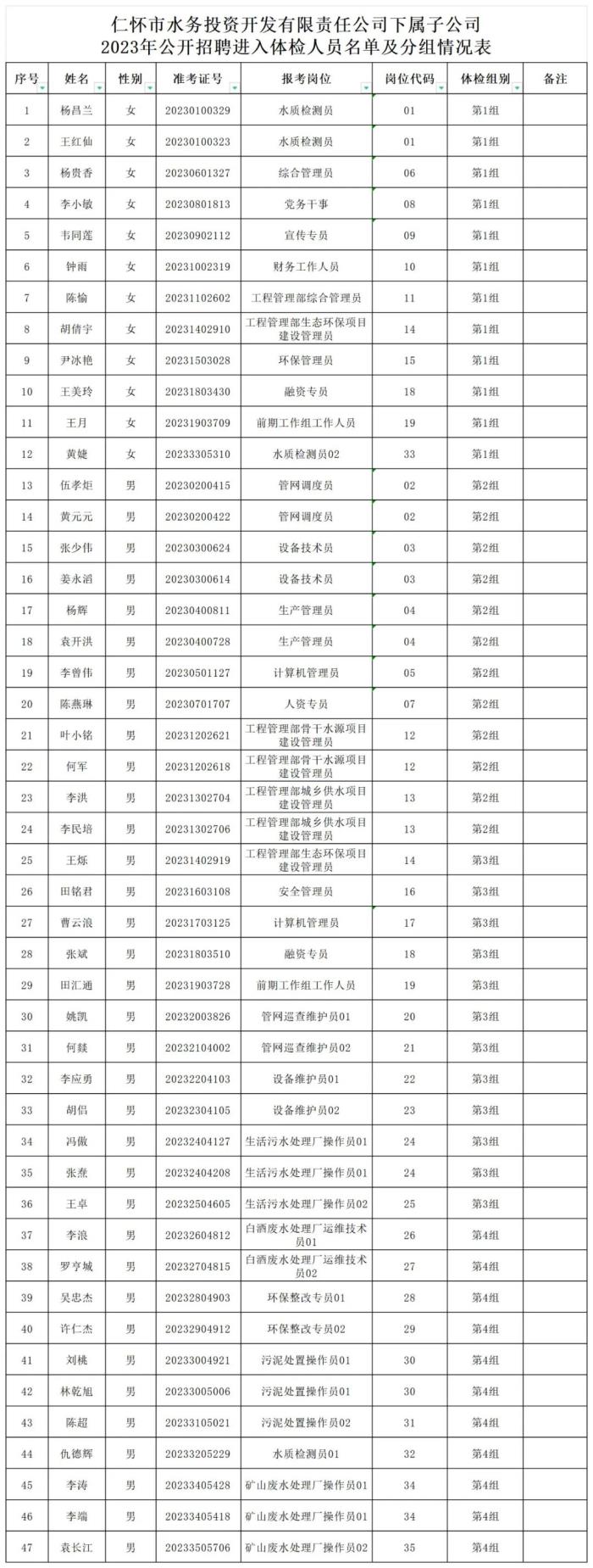 根據(jù)《仁懷市水務(wù)投資開發(fā)有限責(zé)任公司下屬子公司2023年公開招聘簡章》要求,現(xiàn)將進(jìn)入體檢人員名單及體檢有關(guān)事宜通知如下: