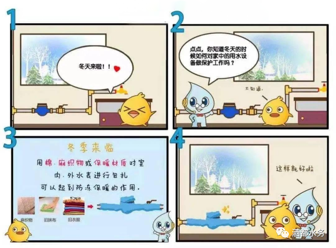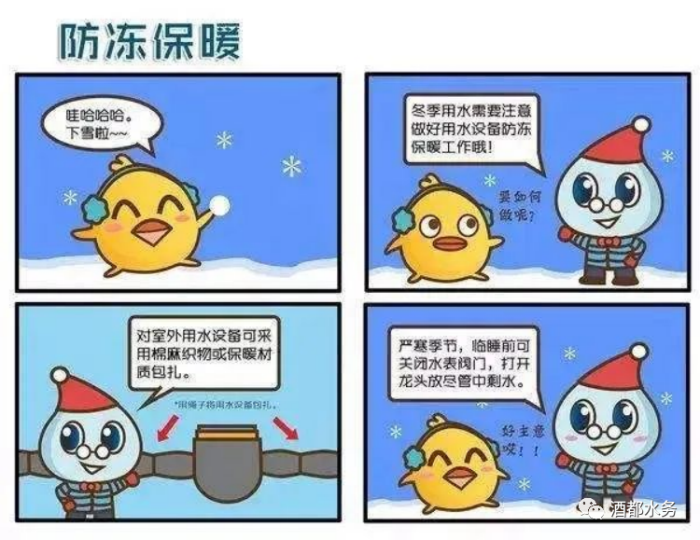 ●強(qiáng)冷天氣不僅要注意自身保暖,也要注意供水設(shè)施保暖,讓我們一起抵御雨雪冰凍天氣,共建供水安全,確保用水無憂!